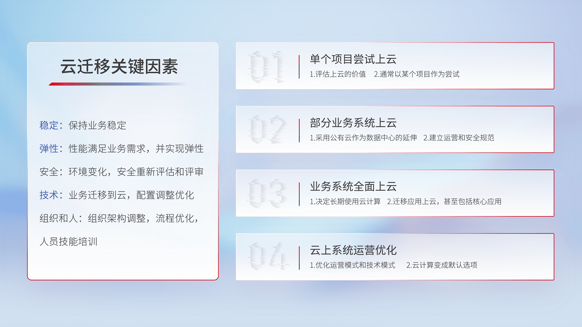 结合实际业务,,从规划设计、、云平台选型、、、、云原生改造、、、数据迁移、、、集成交付,,,迁移全过程为客户识别最佳上云路径,,,做好风险识别管理,,,,设计网络架构、、、身份权限、、、、安全审计合规、、、、操作审计、、、、日志审计、、监控告警策略、、、多站点容灾设计等,,,对云上基础设施进行整体规划,,,,提升IT治理水平,,以满足弹性、、、、高可用、、高性能的需求。。。。