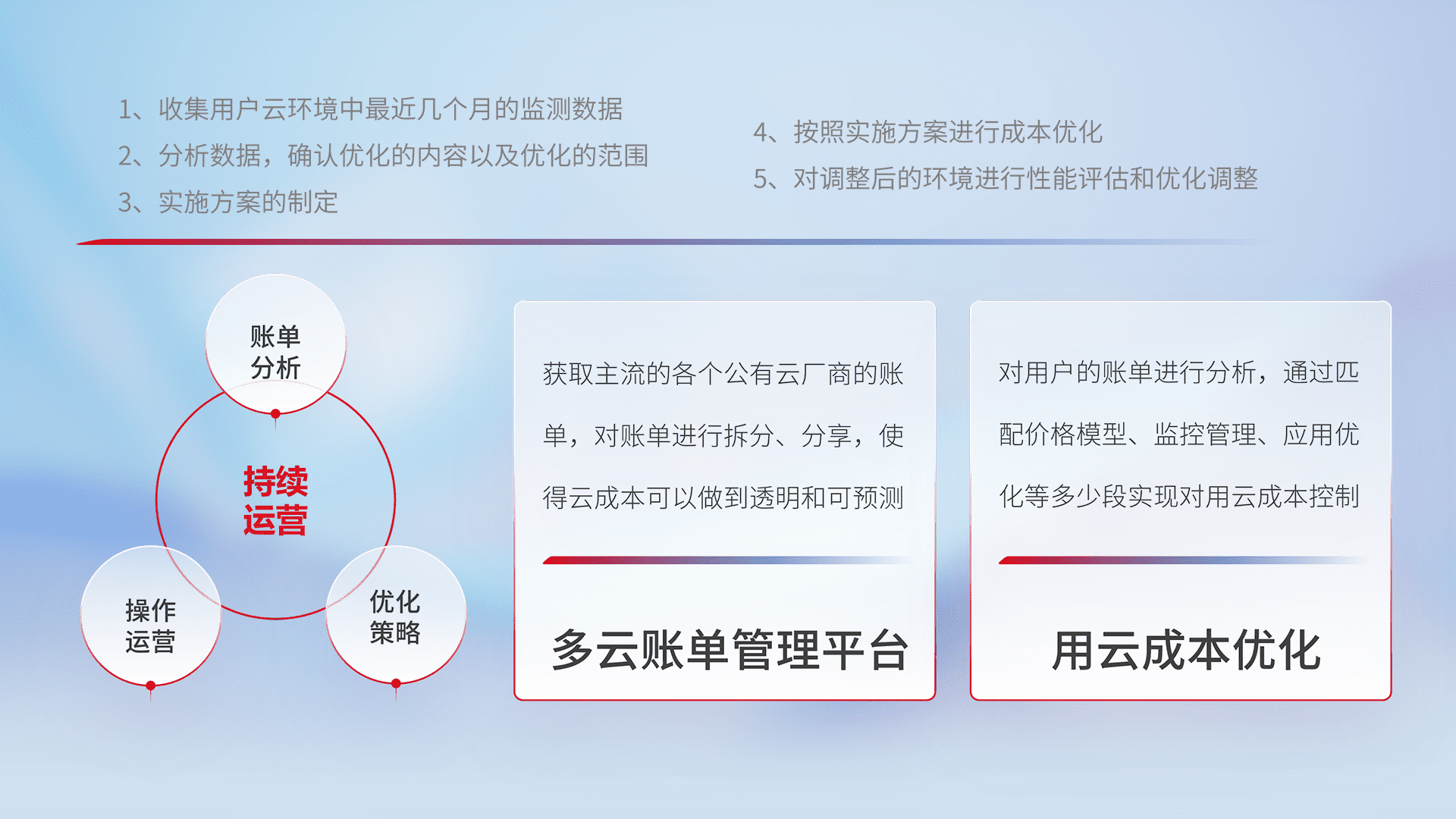 通过多云纳管,,以统一的资源数据模型把客户的云资源进行抽象和封装,,,,进而实现对多云资源的统一操作,,,保障云资源管理的可靠性、、、、稳定性与可用性。。。量身定制化运维内容,,,配置、、、、开发运维、、、、补丁管理、、、备份、、、监控、、、认证和访问管理、、、、审计和日常巡检等,,保障在用云过程中的可靠度,,稳定度以及高可用率。。。